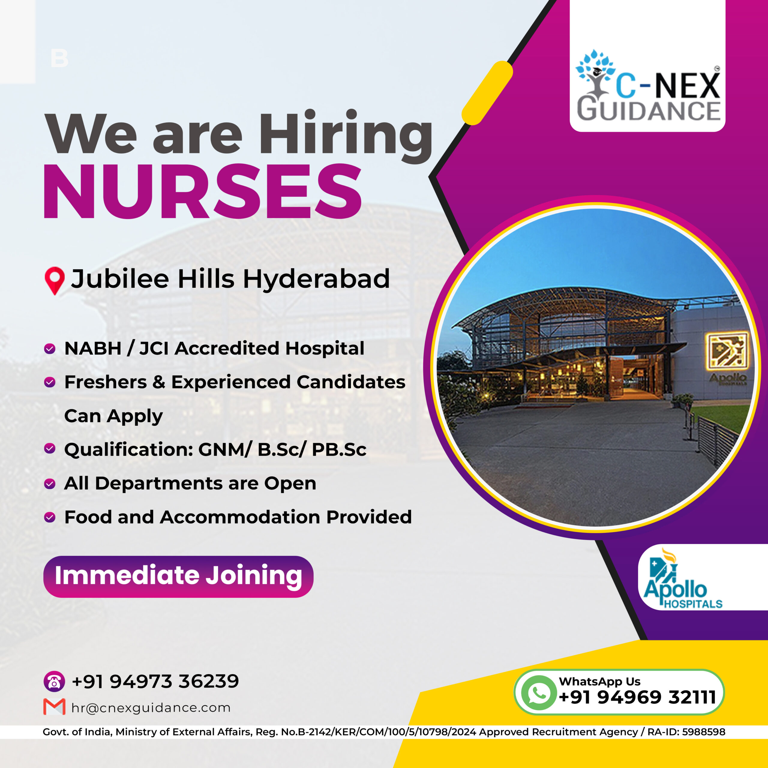Apollo Hospital, Jubilee Hills, Hyderabad – 750+ bedded JCI , NABL accredited Super Speciality Hospital in Hyderabad is looking for Freshers/Experienced M Sc/ B. Sc/ Post B Sc/GNM Nurses to …